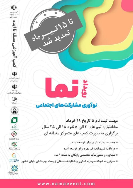 مهلت ثبت نام در رویداد نما (نوآوری مشارکتهای اجتماعی) برای گروههای جوان ۱۸ تا ۲۵ ساله تا ۱۵ تیرماه تمدید شد.